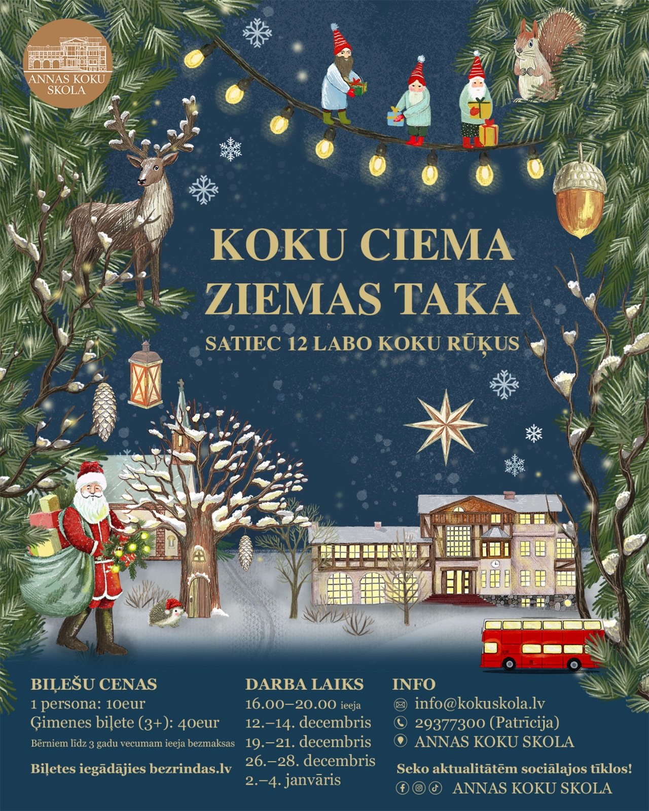 Šajā ziemā sirsnīgi aicinām doties “Koku ciema ziemas takā” – maģiskā pastaigā, kur meža smarža, gaismiņu spēles un rūķu čalas savijas ziemas piedzīvojumā.